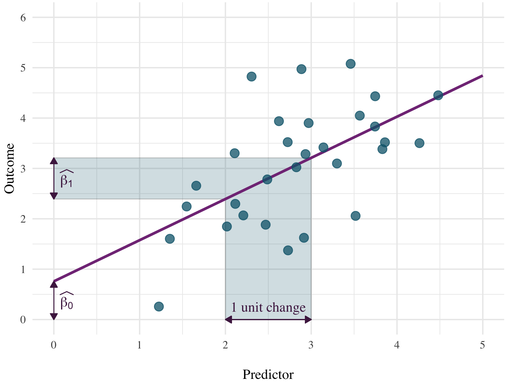 Take a look at the figure below again. Let’s say that we’re increasing from 2 to 3 on the x axis. The line is higher at 3 than it is at 2. What’s the difference in this height? It’s the value labelled as \(\beta_1\) . Eye-balling it, it seems like when x axis is 2, the value on the y axis is about 2.4. When the x axis is 3, the value on the y axis is about 3.2. The difference between these two values is 3.2 - 2.4 = 0.8. So the value of the slope \(\beta_1\) on the figure below would be around 0.8, or close to it.