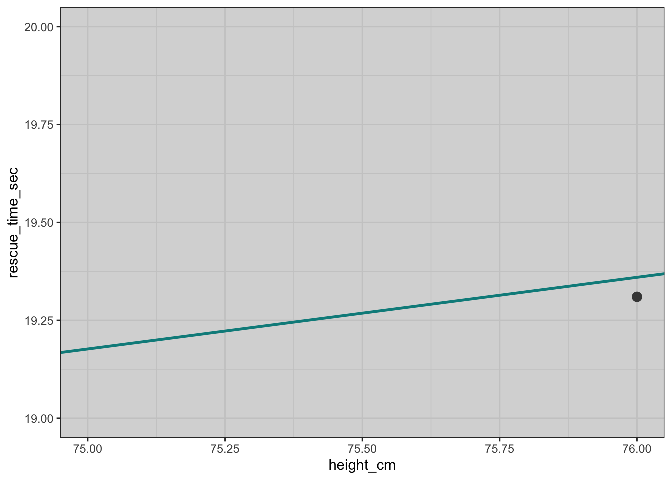 The slope is trickier to guess just from a graph. But let’s do it for the sake of the exercise. I’ve tweaked the coord_cartesian() function again. This time, we’re zooming on the portion of the graph that goes from 75 to 76 on the x axis (because we want an increase one unit) and from 19 to 20 on the y axis (because we want enough zoom to be able to judge the change in the height of the line).