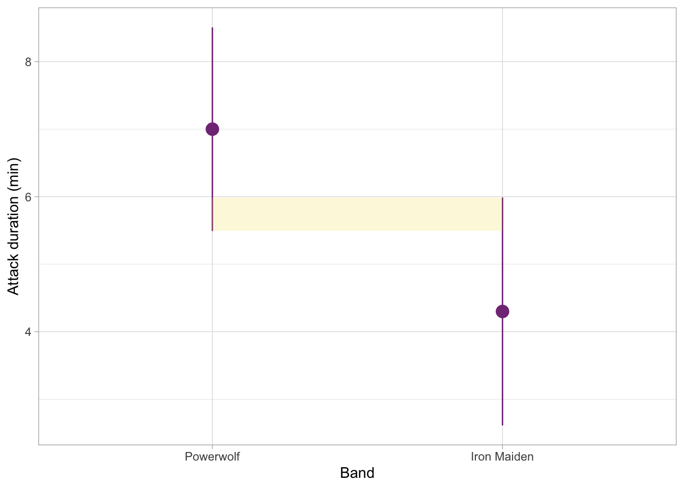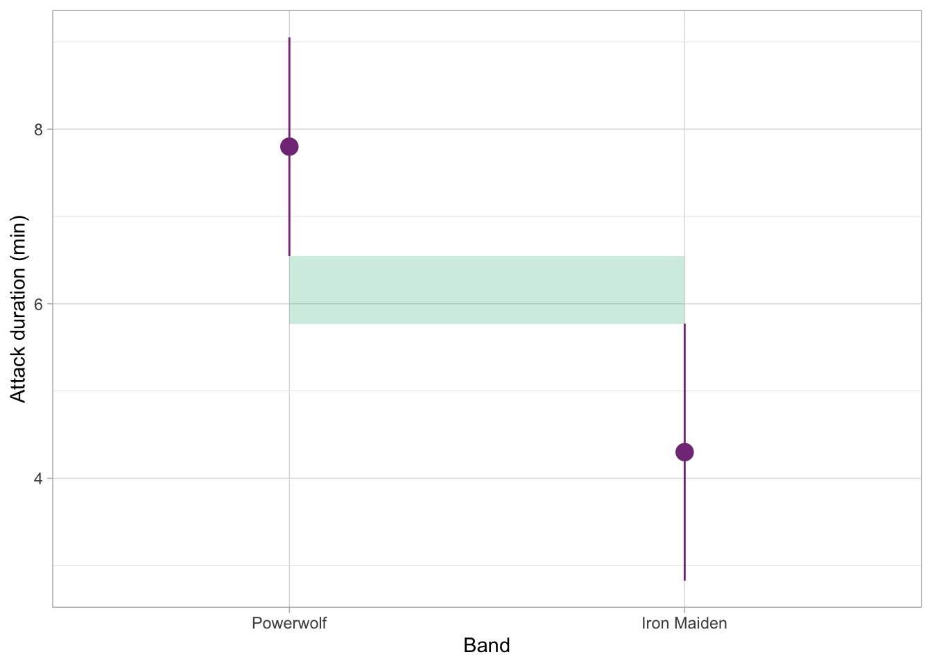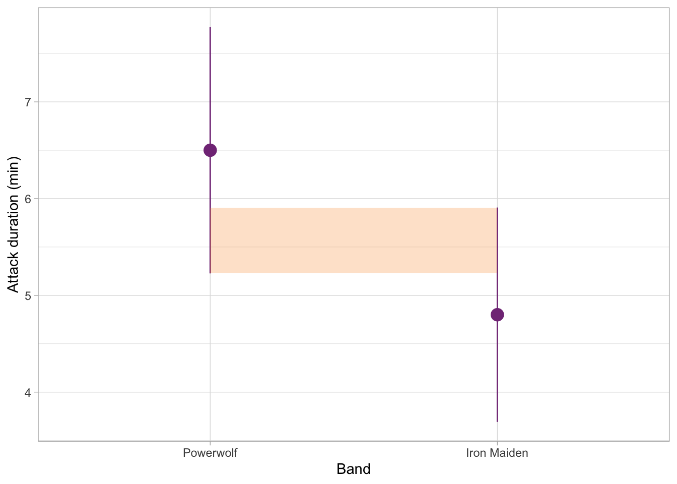 Our dataset contains a variable called band which specifies whether the music that orcas heard was by Iron Maiden, Powerwolf, Opeth, Saor, or Lord of the Lost. That’s quite a few categories, so having all of the summaries for all these groups in a table might get a little overwhelming. So we can create a (gg)plot instead - which will also allow us to visually compare the confidence intervals for these groups.