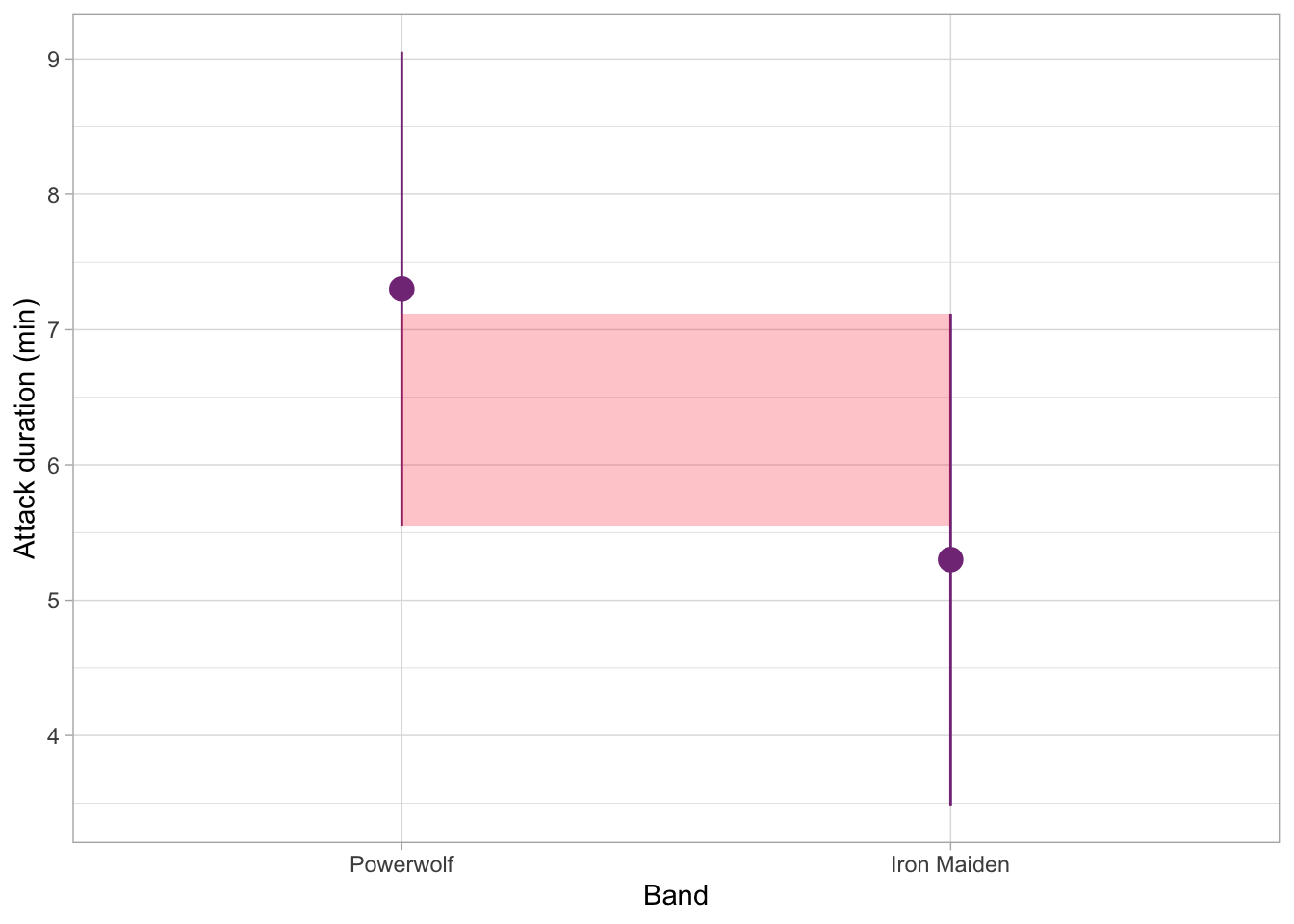 For this plot, we’re going to look at the mean differences among the categories of the band variable. We’re interested in the differences in mean attack_duration and the respective confidence intervals.